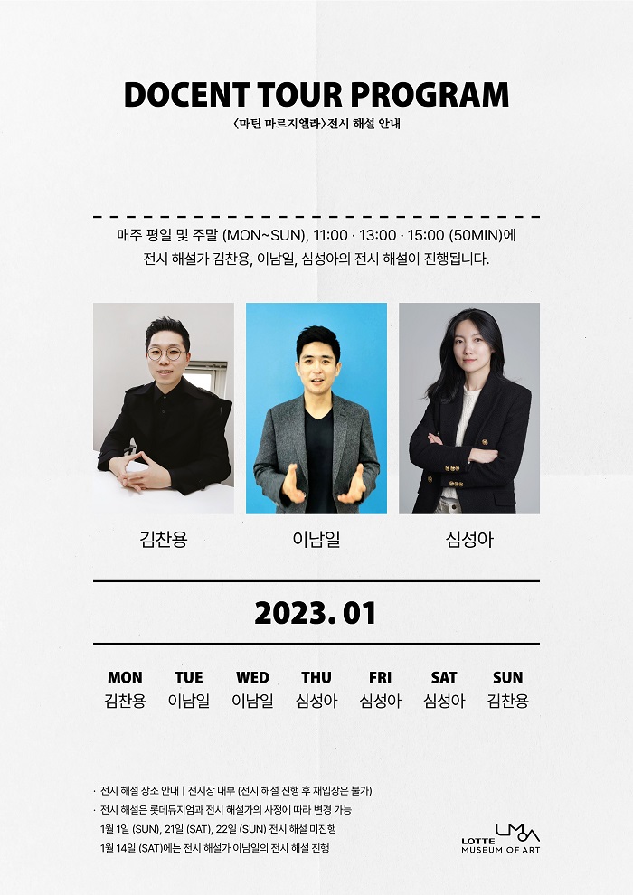 롯데뮤지엄 공간에 따라 새롭게 구성되는 50여 점의 작품 설치로, 기존 작품에 퍼포먼스를 접목하거나 미술관 장소 특정적 설치 작품을 의도적으로 계획하고 배치하여 관람객의 개입을 유도하는 작품 등을 선보이며, 라파예트 안티시페이션(Lafayette Anticipations)에서의 첫 전시에서 나아가 마르지엘라의 예술세계를 더욱 확장시킨다.