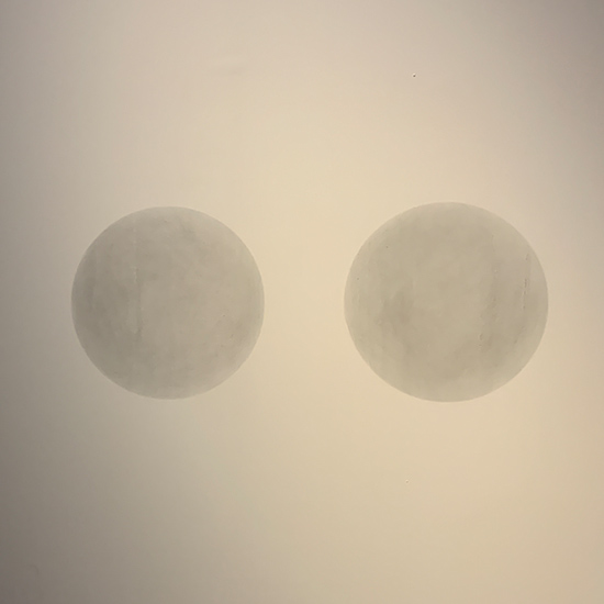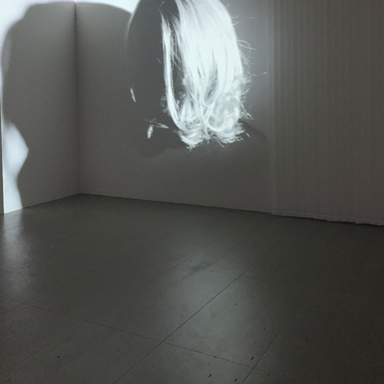 2개의 벽걸이 프로젝터 스크린에 오일 파스텔로 인체를 묘사한 드로잉을 반전시켜 걸어둔 작품