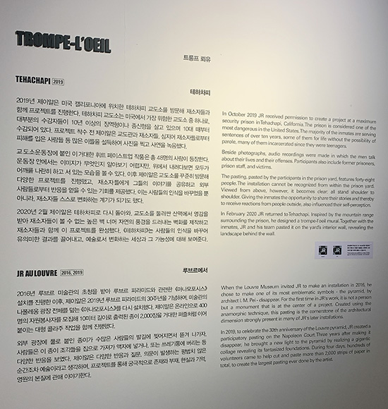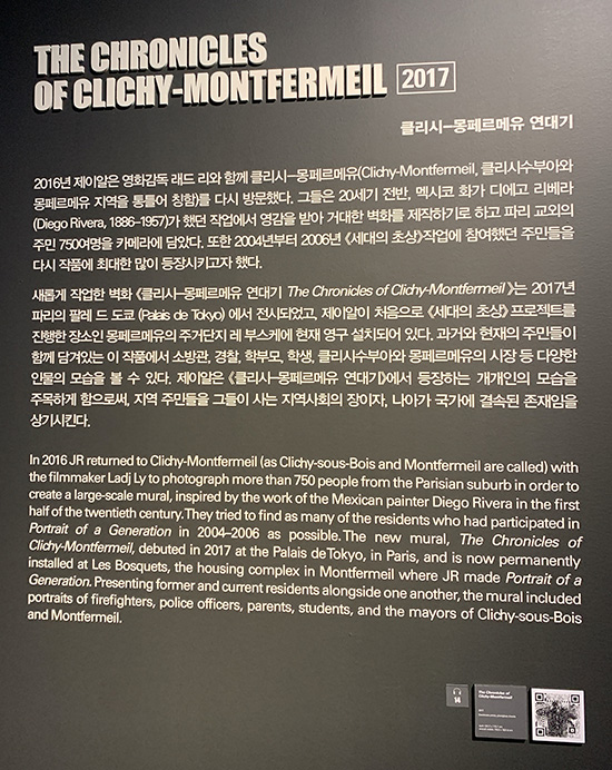 제이알은 작업에 함축된 여러 이야기들을 통해 우리가 세상을 바라보는 관점에 대한 변화를 유도한다. 사진과 페이스트업, 영상, 프로젝트 과정을 기록한 아카이브를 포함한 약 140여 점의 작품들로 구성되는 이번 《제이알: 크로니클스》 전은 국경을 넘어 작가가 전달하고자 하는 동시대의 주요 사회문제에 대한 관심과 대화를 이끌어내는 장이자, 제이알의 독창적인 예술을 경험할 수 있는 기회가 될 것이다.