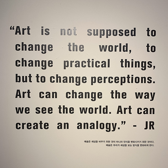 나는 예술이 존재하지 않을 것 같은 장소에 예술을 선보이고 싶다. 그 곳의 사람들과 함께 엄청난 프로젝트를 벌이고, 그들이 스스로에게 질문할 수 밖에 없도록 만들고 싶다.” – 제이알