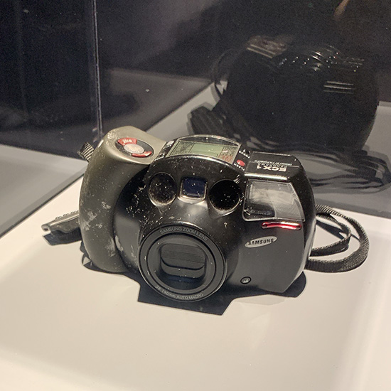 공간에 크게 보이는 이 작품은 언뜻 보면 총처럼 보이지만 카메라.