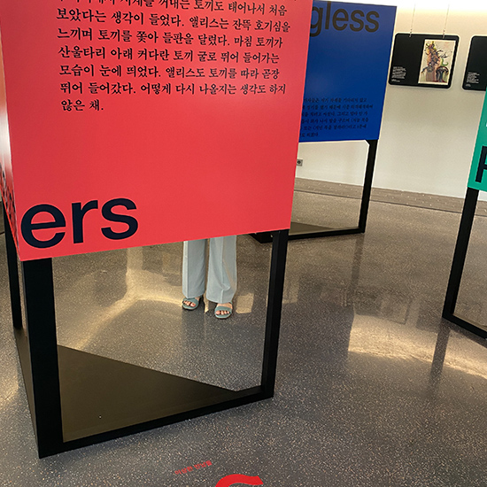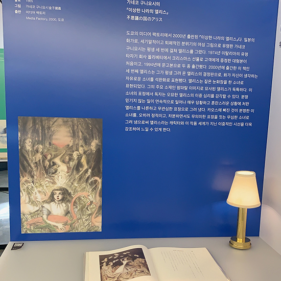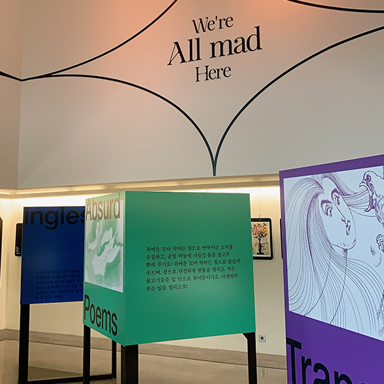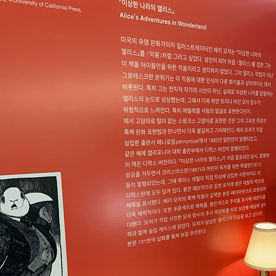 26인의 예술가가 만든 33종의 앨리스 북아트와 함께 〈앨리스〉를 소개한다. 관람 포인트는 〈두 시선〉이다. 〈순수한 소녀의 모험담〉을 담은 동화 이면의 완전히 반대되는 시선을 이번 전시에 끌어온다. 양면의 동전처럼 이 소설은 어린이의 시선과 어른의 시선이 동시에 존재하는 운명을 지녔다. 한 어린이가 이 소설에 푹 빠져 자신이 마치 앨리스가 된 것처럼 이입을 한다면, 처음엔 흥미를 느끼다가도 스물스물 올라오는 이상한 공포를 느낄 것이다. 잘 따져 보면 아이에게 이 상황들은 실로 기괴하고 잔혹한 실존적 고민이 된다.