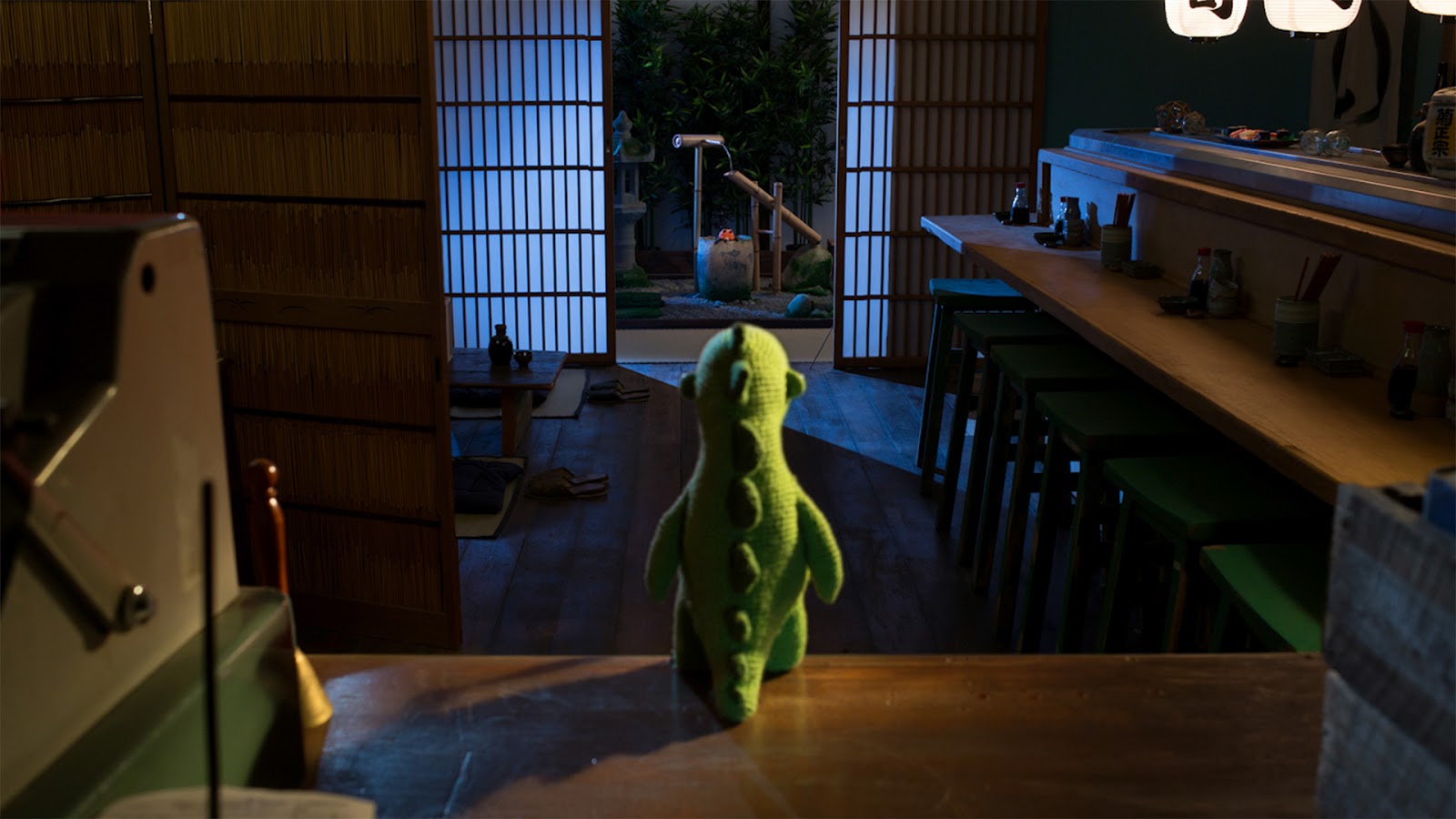 텅빈 식당에 여우와 공룡 인형 둘 뿐