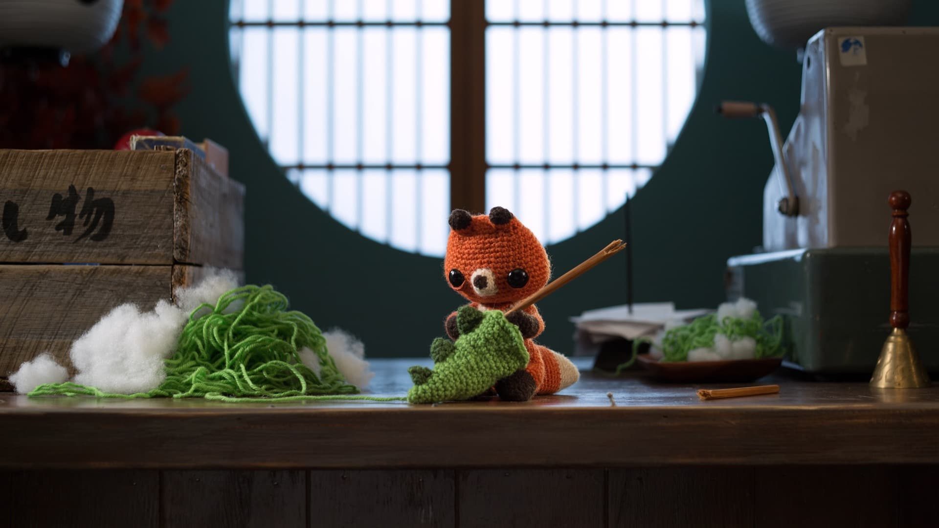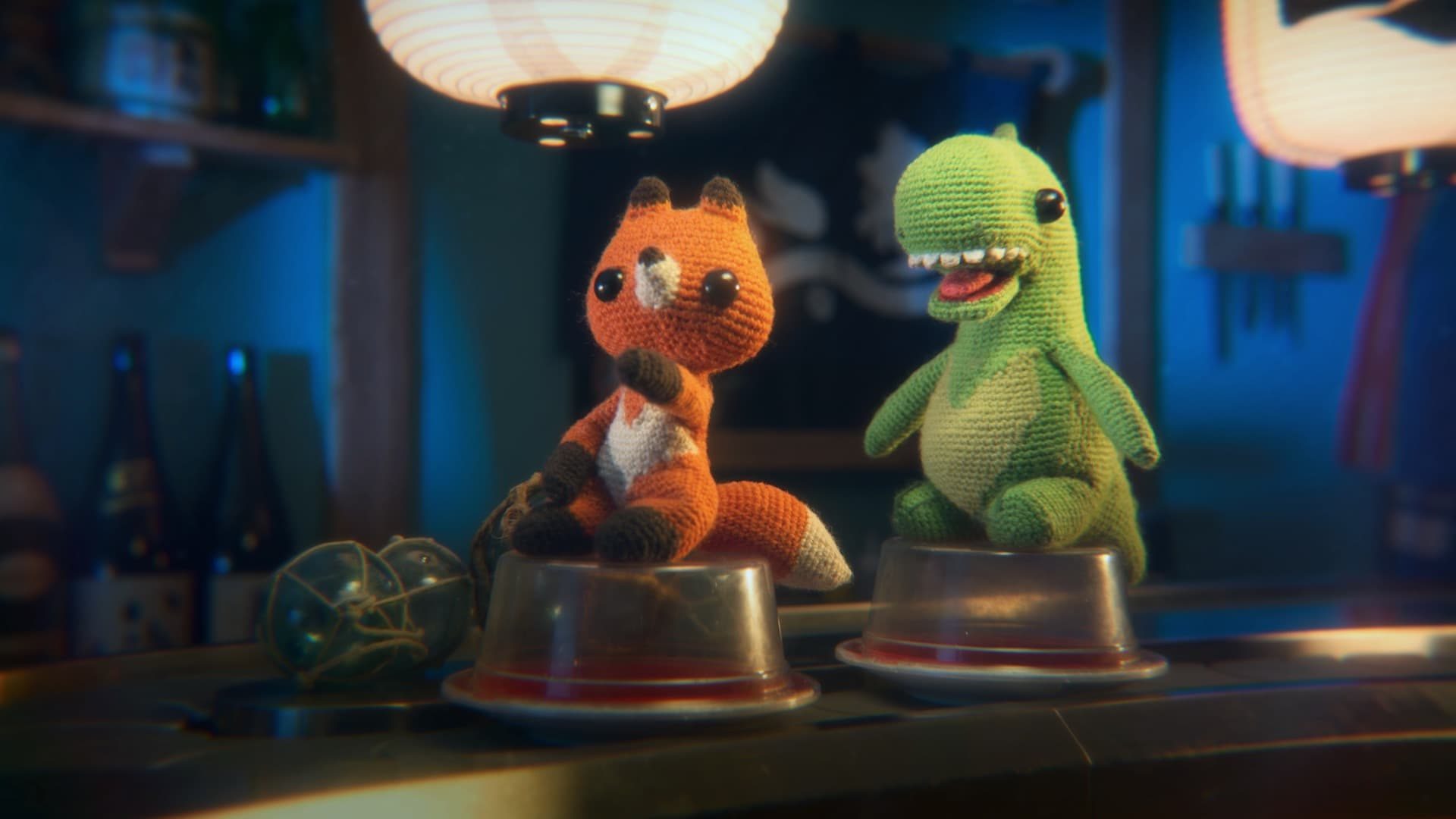 뜨개질로 만들어진 공룡과 여우