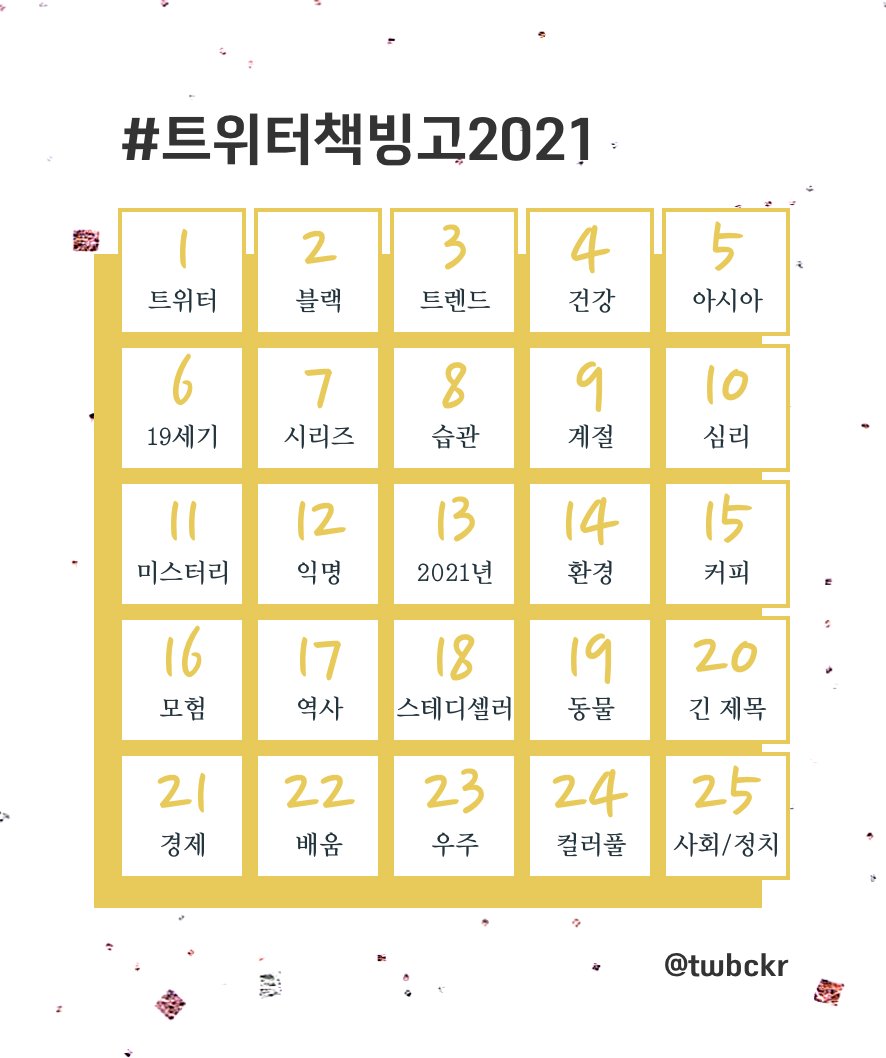 #트위터책빙고2021 1. 트위터 [우리가 날씨다], 조너선 사프란 포어 - 2월 10일 - 하루에 한 끼가 어렵다면, 일주일에 최소 한 번은 채식하는 인간이 되자. 2. 블랙 [무자비한 알고리즘], 카타리나 츠바이크 - 2월 24일 - 표지가 블랙. 알고리즘을 구축할 때 데이터가 필요한데 여기서도 여성데이터는 소외됨. 도랐 3. 트렌드 [재택 HACKS], 고야마 류스케 - 3월 16일 - 새로운 걸 유연하게 받아들이고 배우는 자가 살아남는 것이겠지... 4. 건강 [은밀한 몸], 옐 아들러 - 3월 28일 - 번역 무슨 일이야! 엄청 재미있어!!! 5. 아시아 [둘이서 살아간다는 것], 사쿠라기 시노 - 3월 10일 - 나의 최애 작가님 중 한 명 ㅋㅋ 잔잔하니 찌통없이 좋았다. 6. 19세기 7. ..